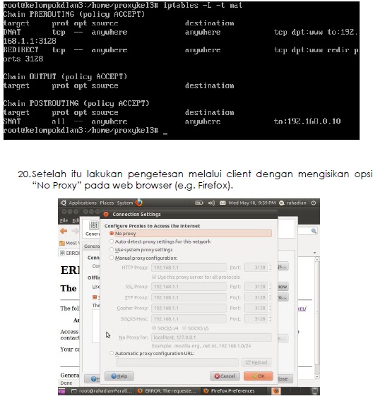 Maka pada firewall router kita buat satu aturan yang menyatakan bahwa setiap paket yang datang dari jaringan lokal menuju ke port 80 harus dibelokkan ke arah alamat HTTP proxy server port 3130. Akibatnya, semua permintaan web dari pengguna akan masuk dan diwakili oleh HTTP proxy server diatas.